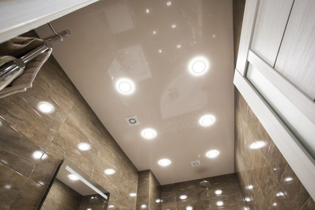 В ванной комнате очень гармонично будет смотреться глянцевый натяжной потолок, отраженная на потолке вода, зрительно увеличит малогабаритное помещение. Потрясающего светового эффекта можно добиться установив несколько точечных светильников, а многообразие выбора цветовых решений подчеркнут любой интерьер.
