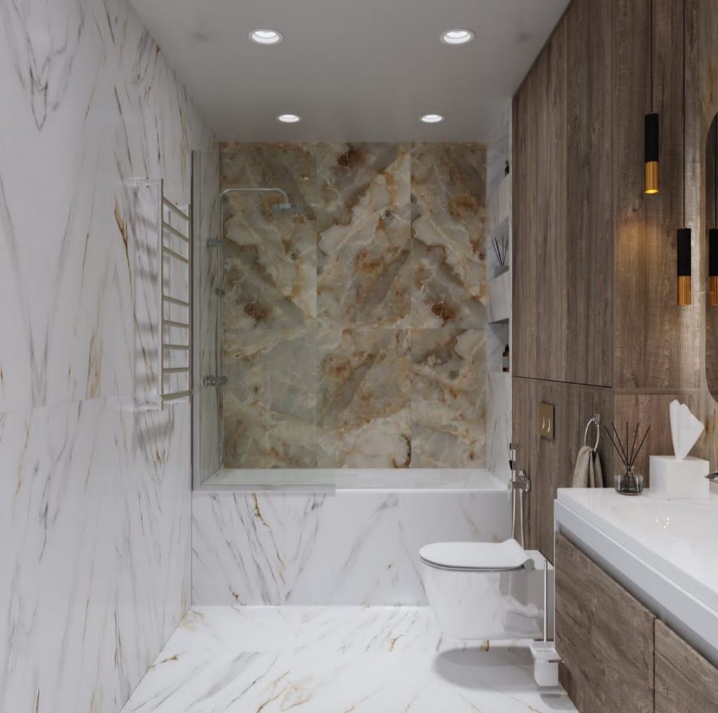 Глянец отражая поверхность увеличивает площадь, отлично сочетается с плиткой. Широкий ассортимент палитры, позволяет подобрать цвет полотна под плитку. Мат, сатин – классический варинат.